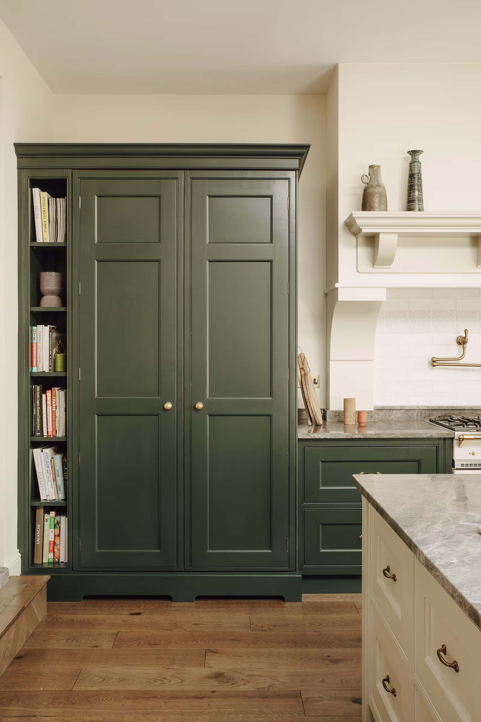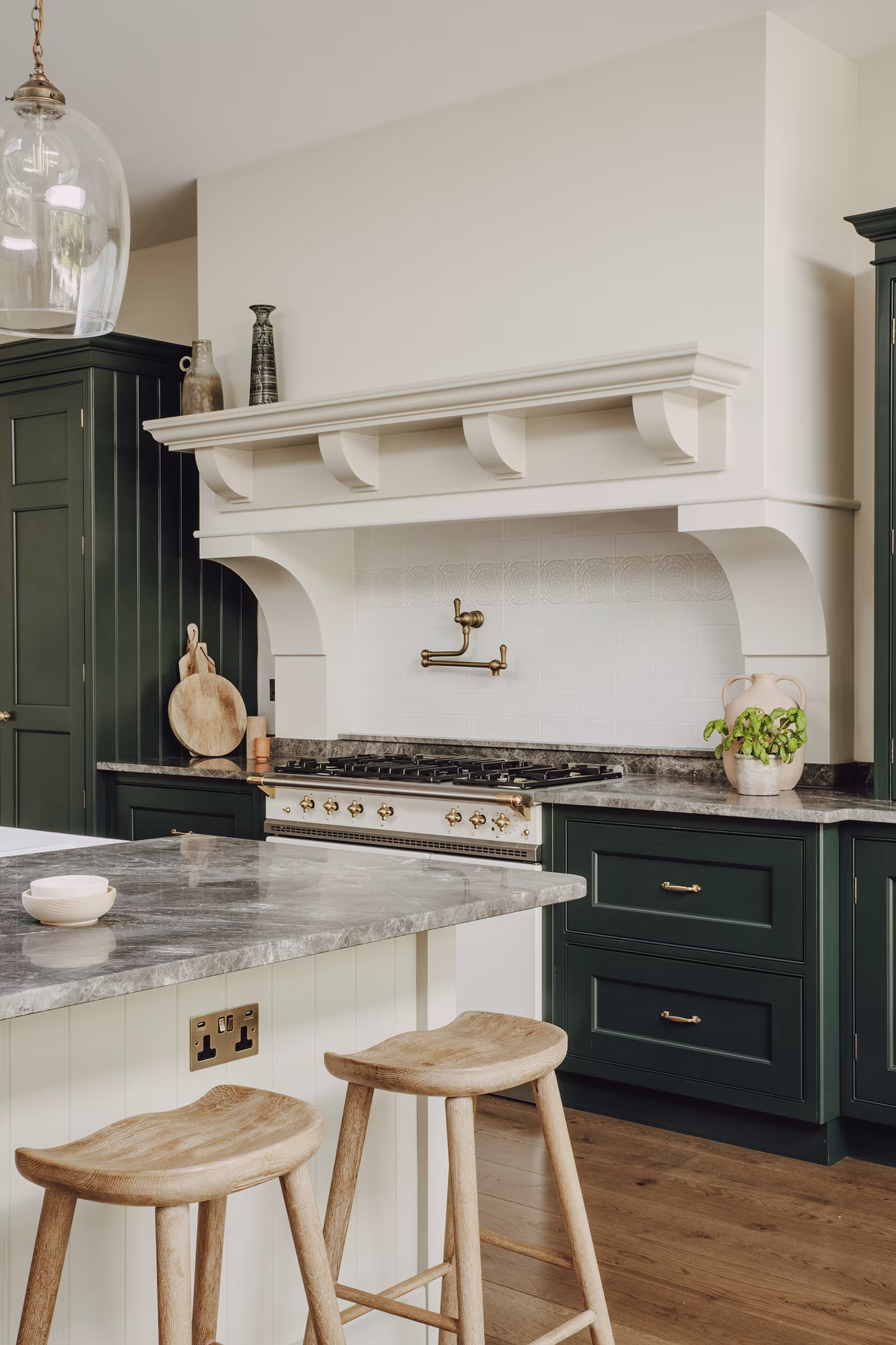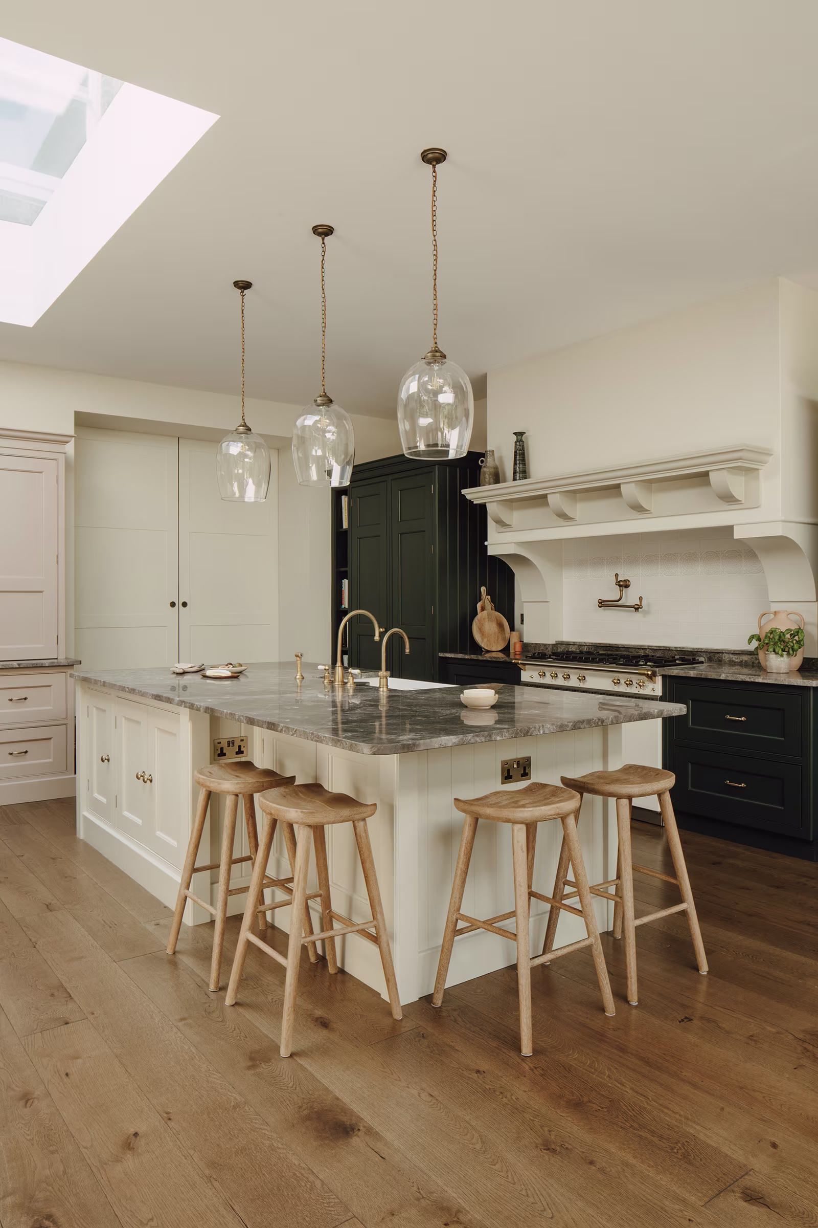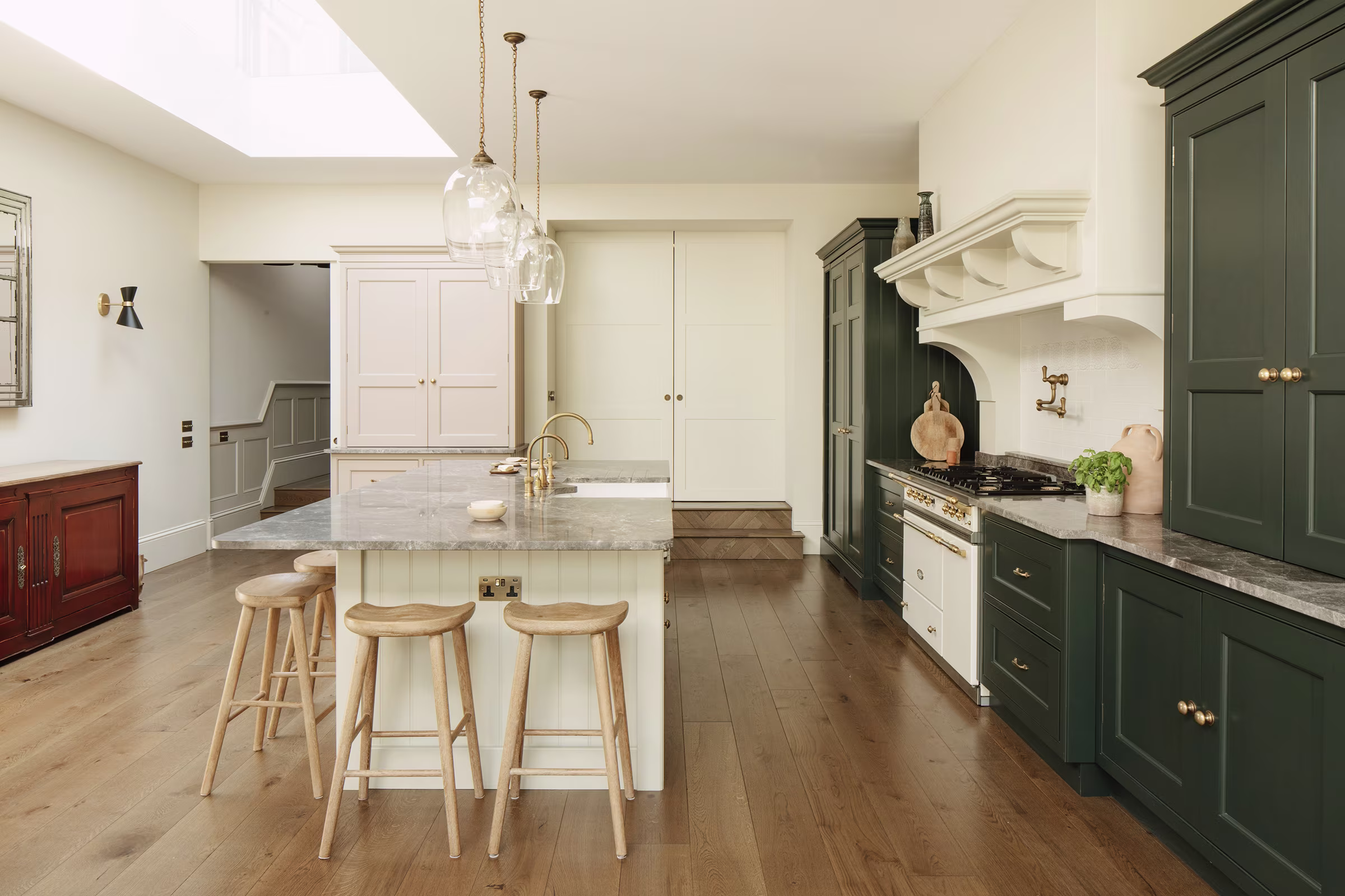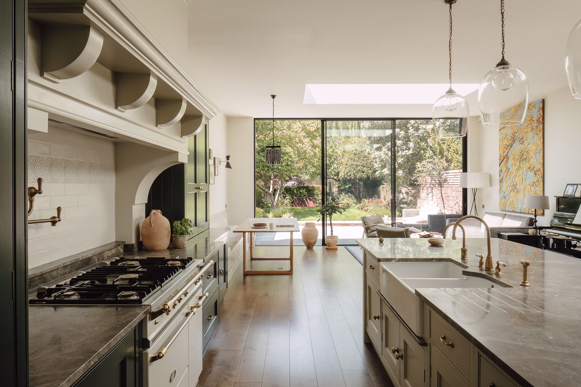 This Balham home offers a hidden sanctuary defined by light and texture, with a cohesive, interconnected flow between living areas. A wooden hallway leads to the kitchen, where floor-to-ceiling glazing provides a dramatic view of the rear garden, blurring interior and exterior lines. Our design prioritised generous walkways and furniture tailored to the family's needs, avoiding the temptation to over-furnish the expansive room. This focus ensured a practical yet comfortable space. Storage is discreet, featuring a Dead Salmon larder dresser for cooking supplies and flanking dressers for integrated appliances, cookbooks, and crockery. Sensitive colours and materials, like earthy grey marble, unite the design. The result is a kitchen balancing practical functionality with ample room for treasured eclectic finds, creating an inherently familiar space where ease prevails.