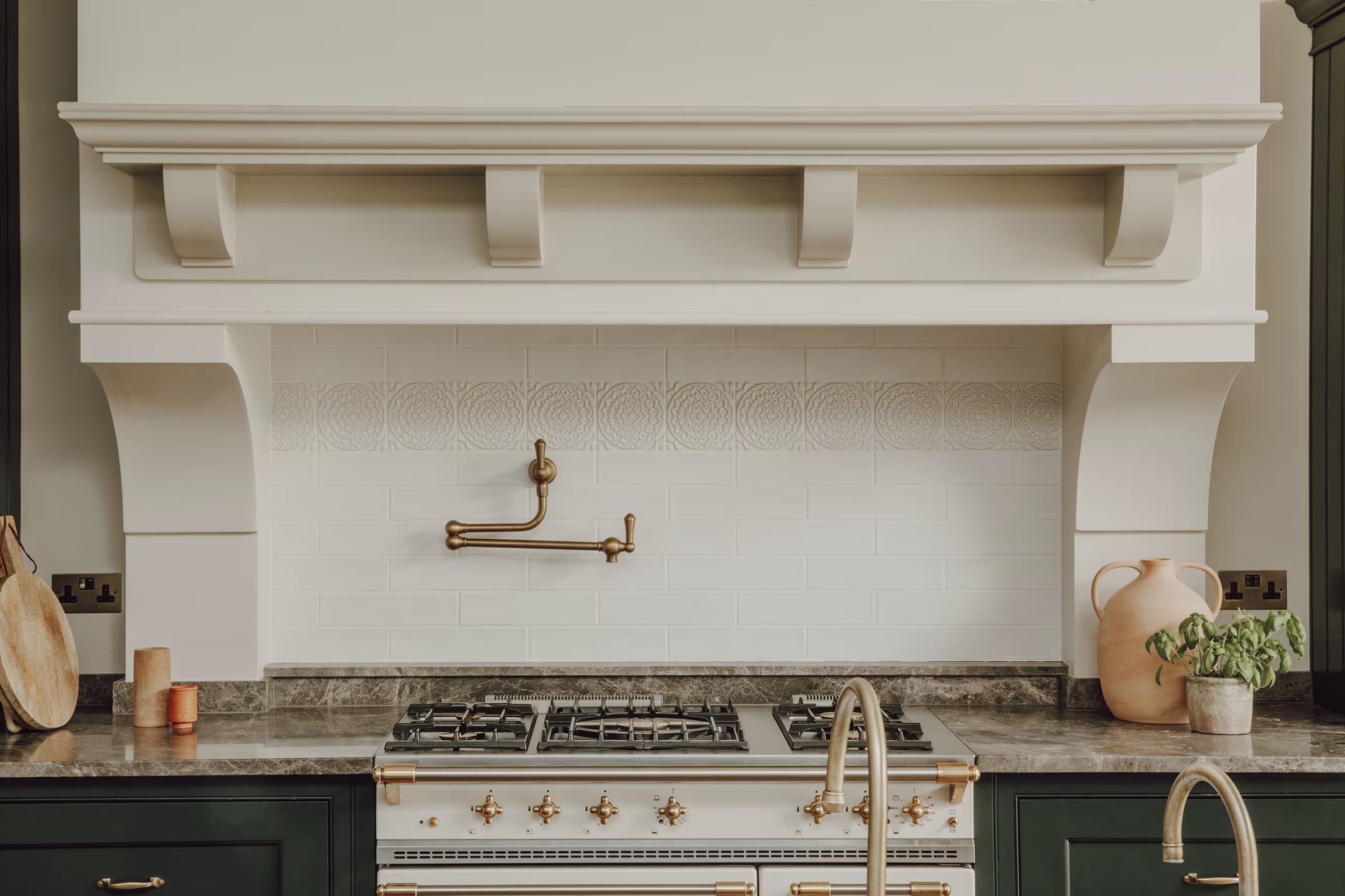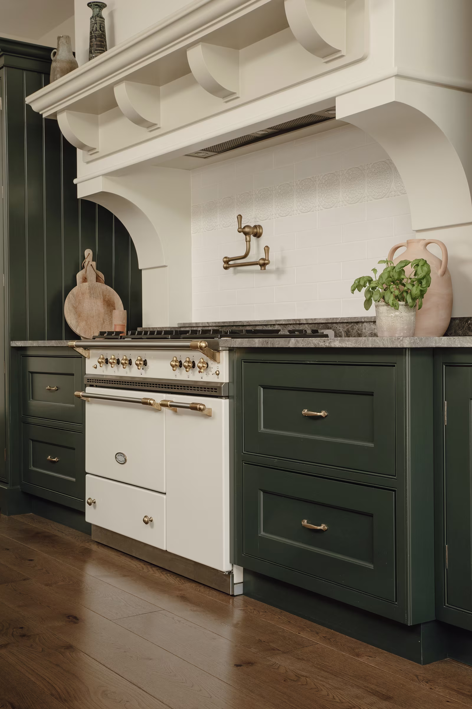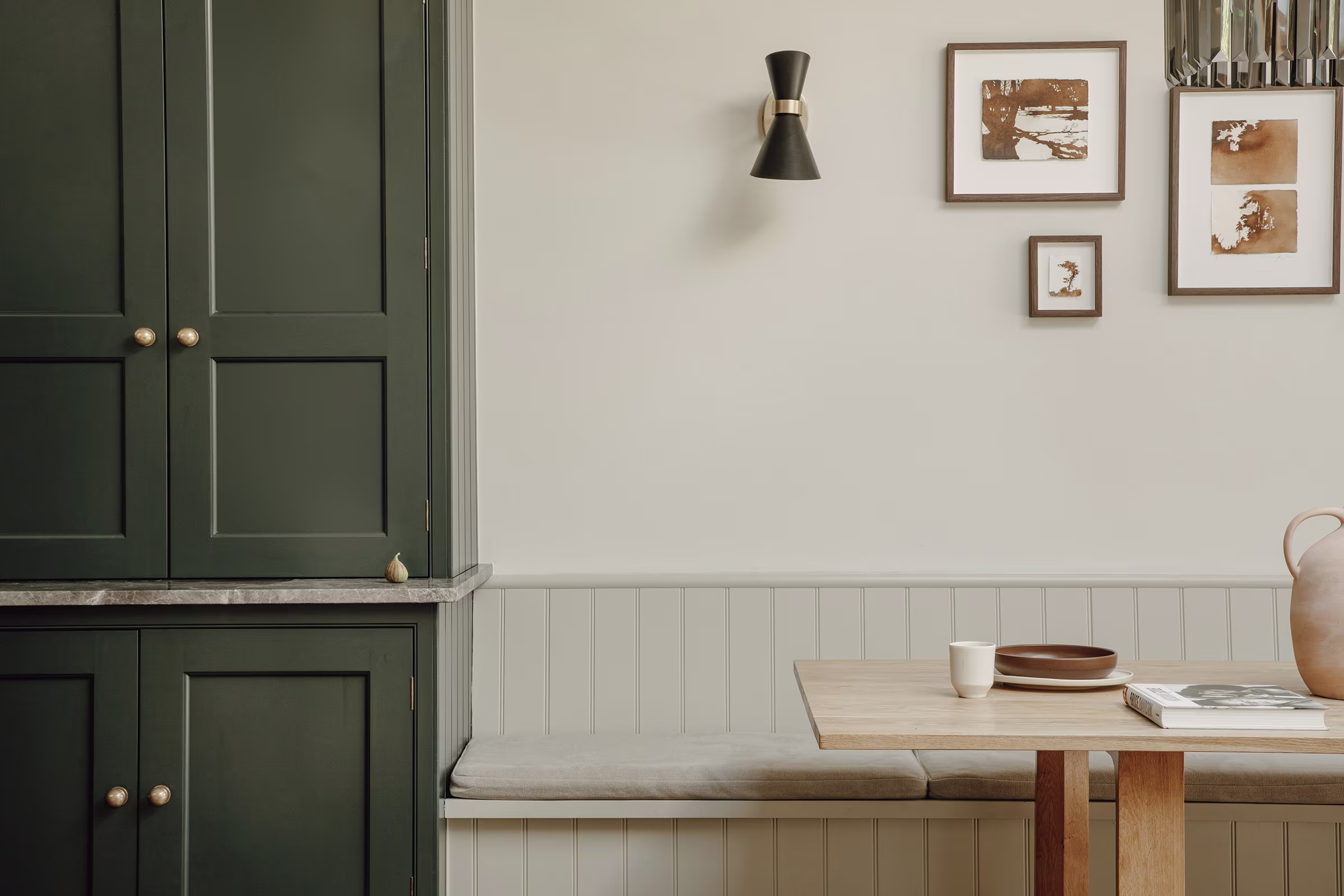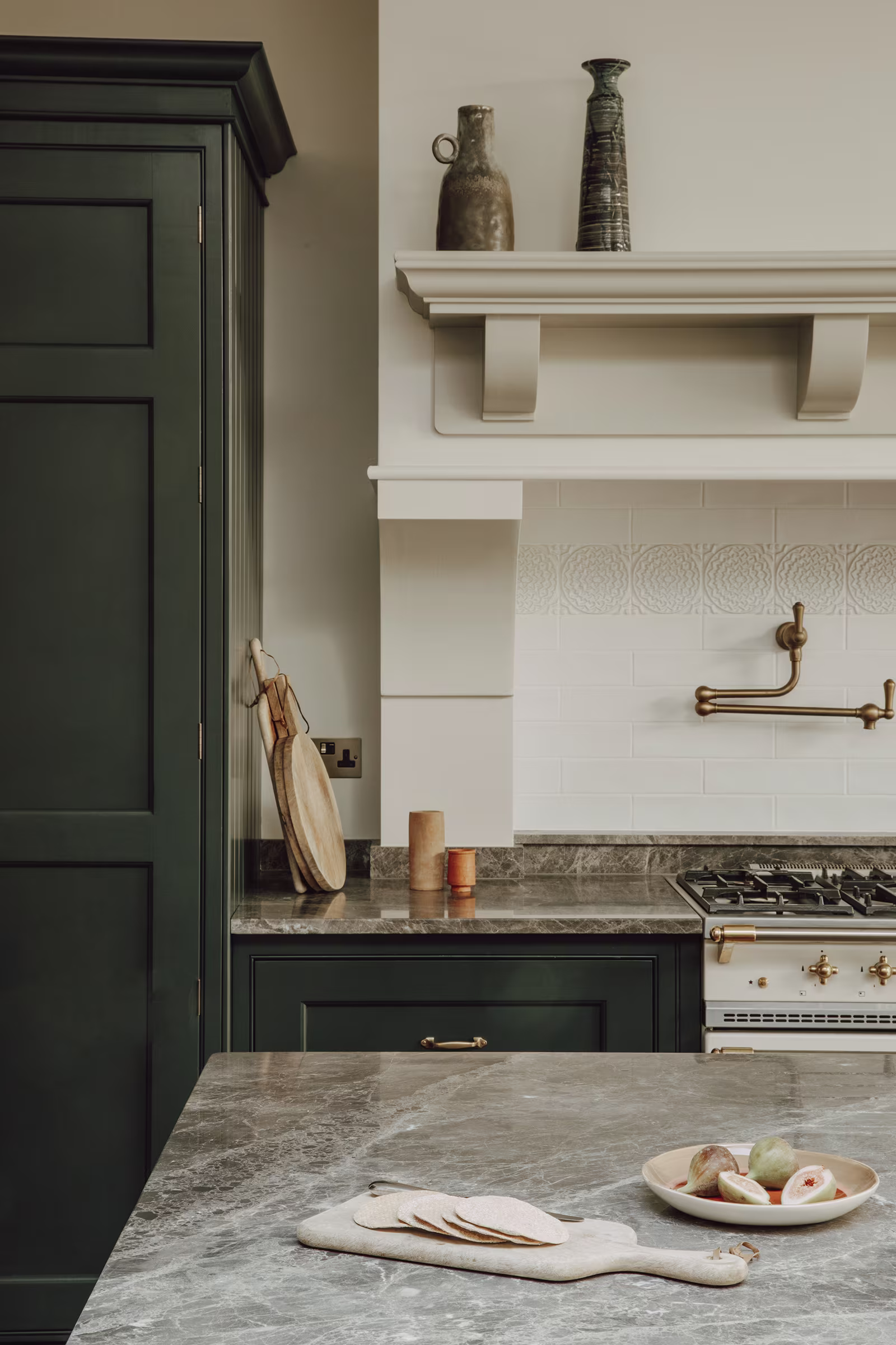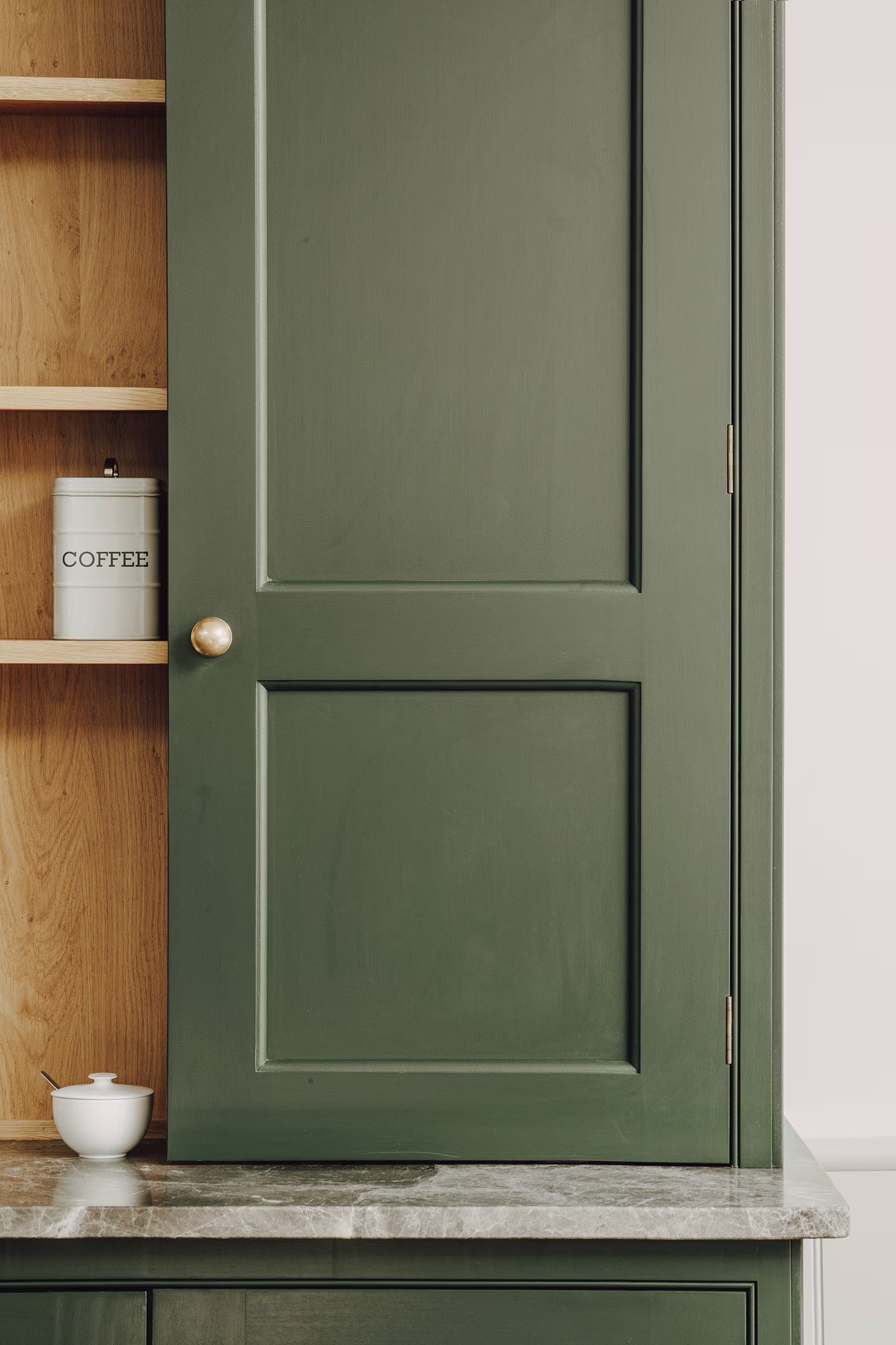 This Balham home offers a hidden sanctuary defined by light and texture, with a cohesive, interconnected flow between living areas. A wooden hallway leads to the kitchen, where floor-to-ceiling glazing provides a dramatic view of the rear garden, blurring interior and exterior lines. Our design prioritised generous walkways and furniture tailored to the family's needs, avoiding the temptation to over-furnish the expansive room. This focus ensured a practical yet comfortable space. Storage is discreet, featuring a Dead Salmon larder dresser for cooking supplies and flanking dressers for integrated appliances, cookbooks, and crockery. Sensitive colours and materials, like earthy grey marble, unite the design. The result is a kitchen balancing practical functionality with ample room for treasured eclectic finds, creating an inherently familiar space where ease prevails.